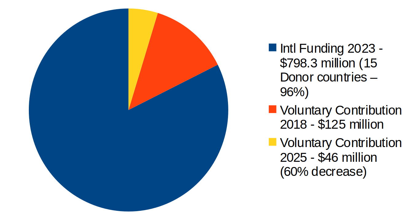 The scale of humanitarian mine action is vast, requiring hundreds of millions of dollars in annual funding and the coordinated effort of numerous international and local organisations. Despite the immense and increasing need, humanitarian mine action faces a persistent challenge of declining funding from traditional donors. In 2023, 34 donors provided $798.3 million in international support for mine action, a similar amount to 2022. However, this is largely driven by a small number of top donors. Funding remains concentrated among a small group of contributors. In 2023, the 15 largest donors provided 96% of all international funding. The United States, Germany and the European Union were the three largest contributors. A 2025 UN report noted that voluntary contributions to the UN Trust Fund for Mine Action dropped significantly, from $125 million to $46 million over seven years. This downward trend undermines the sustainability and effectiveness of global mine action efforts. In 2023, half of all international funding went to support clearance and integrated clearance programs. Victim assistance received only $47 million or 6% of total funding, despite a 25% increase from the previous year. Most of this was directed to just five states. Experts have called for innovative financing solutions and stronger partnerships with the private sector and philanthropic institutions to address the persistent funding gap and better link mine action with sustainable development goals.